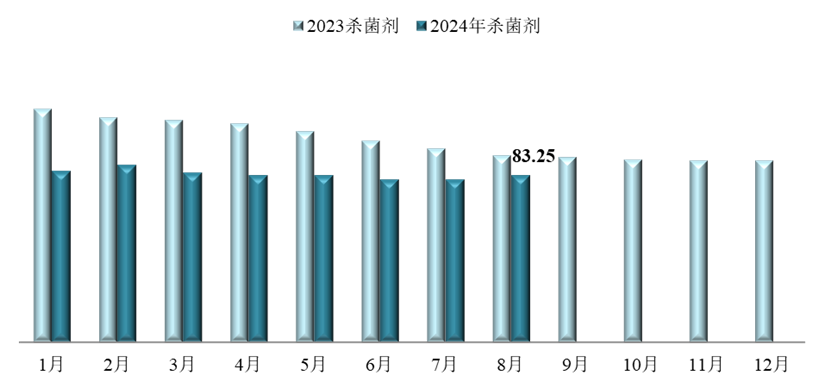 杀菌剂价格指数为83.25,环比上涨3.04%,同比下跌10.55%。监测在内的30种杀菌剂产品中,加权平均成交价格环比上涨的14种,环比持平的1种,环比下跌的13种;加权平均成交价格同比上涨的4种,同比持平的2种,同比下跌的22种。